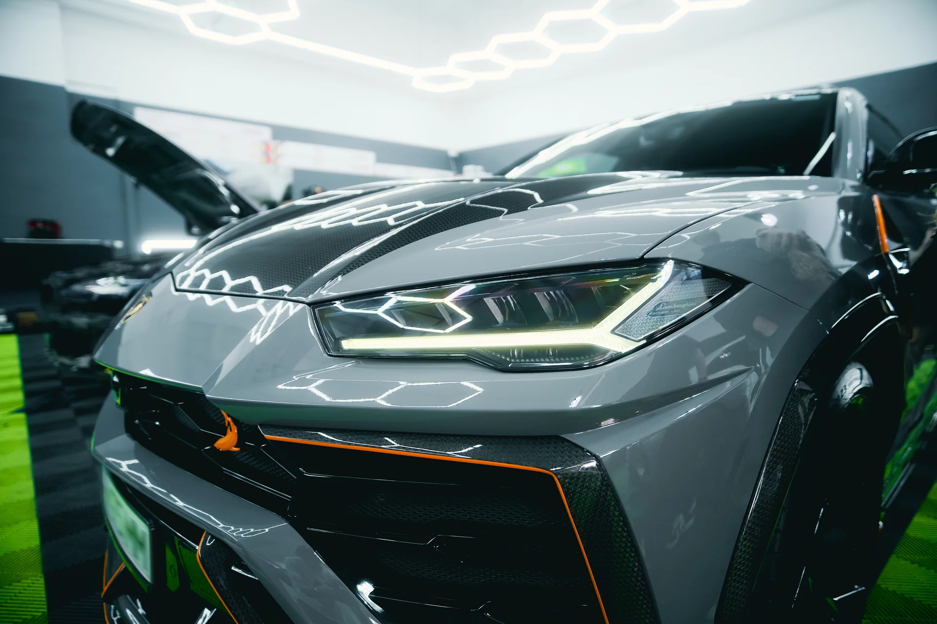 Lamborghini Urus to projekt, który wymaga równocześnie precyzji technicznej, estetycznej odwagi i doświadczenia z autami najwyższej klasy. Ten konkretny egzemplarz trafił do nas jako kompleksowa transformacja — nie korektka, a gruntowna przemiana od pierwszej do ostatniej linii karoserii. Projekt rozpoczął się od demontażu starej folii ochronnej, która pokrywała część nadwozia. Po pełnej dekontaminacji lakieru i inspekcji pod lampą korekcyjną oceniliśmy stan powierzchni i przystąpiliśmy do kolejnych etapów. Całe nadwozie zostało pokryte folią PPF ze zmianą koloru — matową, satynową powłoką, która całkowicie przekształciła wygląd auta, zachowując jednocześnie trwałą ochronę lakieru przed odpryskami i zarysowaniami. Na folię PPF nałożyliśmy ceramikę, która wzmocniła hydrofobowość, ułatwiła pielęgnację i pogłębiła jedwabisty efekt wykończenia. Równolegle wykonaliśmy lakierowanie zacisków hamulcowych w kolorze dopasowanym do nowej stylistyki auta — detal, który przy takim projekcie ma ogromne znaczenie wizualne. Kluczowym elementem transformacji był montaż body kitu od TopCar z dedykowanymi felgami — agresywny, spójny pakiet nadwoziowy, który radykalnie zmienia profil Urusa. Wybrane elementy zewnętrzne zostały dodatkowo oklej one dekoracyjną folią w kolorze nawiązującym do koloru tapicerki salonu, tworząc rzadko spotykaną spójność między wnętrzem a bryłą auta. Na felgi nałożyliśmy ceramikę, która chroni je przed solą, hamulcowym pyłem i korozją. Na końcu zadbaliśmy o wnętrze — skórzana tapicerka przeszła profesjonalne czyszczenie i odżywienie, przywracając miękkość i głębię naturalnej skóry. Efekt końcowy: Urus, który nie wygląda jak żaden inny. Spójny projekt od felg po dach, zabezpieczony na lata.